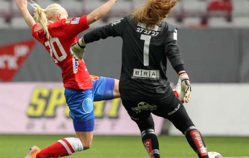Direkt efter avspark i den andra halvleken, slår KIF Örebro en lång boll ner i motståndarnas straffområde. En Jitex-försvarare kommer lite på efterkälken och river ner Lucie Martinkova. Domare Tess Pettersson tvekar inte utan pekar på straffpunkten. En kalldusch för gästerna när lagkapten Elin Magnusson kliver fram och sätter straffen säkert i mål.