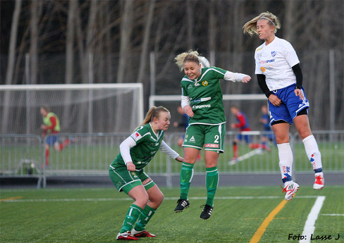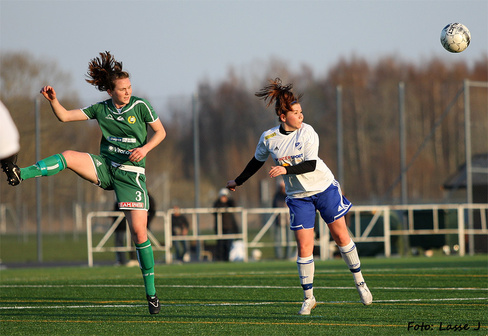 IFK Nyköpings Amanda Nordlie i nickduell på mittfältet.