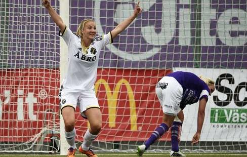 AIKs Emma Lundh efter att ha petat in segermålet 3-2. FOTO: Carl Sandin, Bildbyrån.
