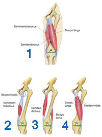 Hamstringsmusklerna består av fyra st muskler. Semitendinosus, Semimembranosus och slutligen Biceps Femoris som har ett långt och ett kort huvud och därför kan sägas vara två olika muskler där det korta huvudet ligger dolt under det långa, se bild 1. Det gemensamma ursprunget för alla muskler utom biceps korta huvud är sittbensknölen. Semimembranosus (bild2) och Semimembranous (bild 3) fäster på underbenets (tibias) insida och de två bicpesmusklerna på underbenets utsida (på både tibia och fibula) se bild 3 och 4. Samtliga fyra muskler böjer i knäleden och alla utom biceps korta muskel sträcker i höftleden. Biceps långa utåtroterar i höften och Semitendinosus och –membranosus inåtroterar i samma led.