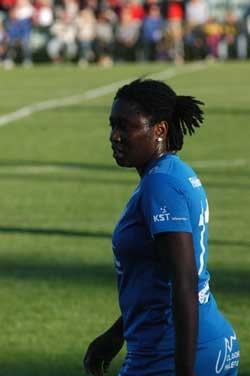 Det andra målet tillkom då Amanda Fredriksson var på väg igenom, men revs ner strax utanför straffområdet. Mamy Ndiaye fick dock tag i bollen och kunde runda Lindsdals-målvakten och enkelt slå den i mål. mami.jpg