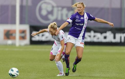 T v LdB FCs Elin Rubensson i kamp med Jitex´ Fridolina Rolfö. FOTO: Per Friske, Bildbyrån.