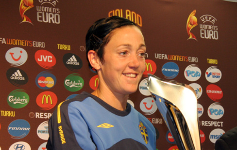 -Vem behöver en sjumannaplan, undrar Therese Sjögran som läst artikeln på damfotboll.com efter dagens träning.
