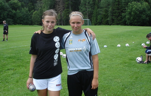 Damfotbolls utsände hinner som hastigast prata med ett par av tjejerna ur den äldsta gruppen., ”96-orna” Ellinor Bertilsson och Christina Mårtensson, med hemadress Linköping respektive Sollentuna.