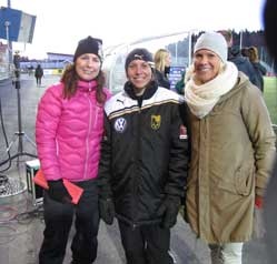 UNDRE BILDEN : Idel ädel fotbollsadel på T3 Arena: Malin Moström, Hanna Ljungberg och Anna Sjöström samt i bakgrunden TV4 Sports expertkommentator Hanna Marklund.: FOTO: Berit Aspgren