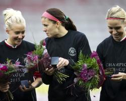 Julia Spetsmark (v), Stephanie Labbé (m) och Elin Magnusson tittar på sina silvermedaljer. Foto: Bildbyrån