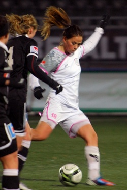 Bild: Sara Björk Gunnarsdottir, en av de hårdast arbetande Malmöspelarna testar skott.