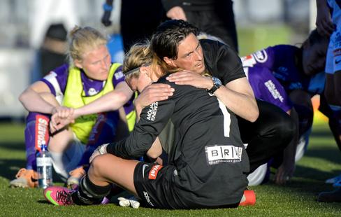 Jitex målvakt Jennifer Falk kramas om av tränare Jerry Carlsson efter vårens match i damallsvenskan mellan Jitex och Rosengård. Foto: Bildbyrån