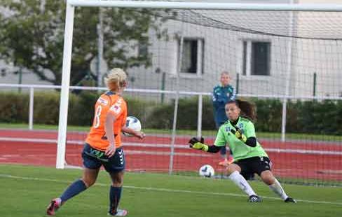 Karin Lundin fullbordar sitt hat-trick mot Östersunds DFFs målvakt Fanny Edström. FOTO: Jan Andersson