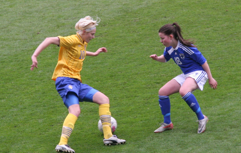 Finlands Vera Saastamoinen och Taru Lindgren hade matchens första avslut som Maja Olsson (Boo IF) i målet räddade.