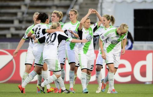 Måljubel – ett ständigt återkommande inslag när tyska mästarna Wolfsburg spelar (Foto: Bildbyrån)
