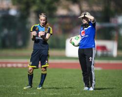 − Någonstans så utvecklas svensk landslagsfotboll hela tiden. Vi puttrar och puttrar uppåt. Ibland blir vi trea, ibland femma, säger den assisterande förbundskaptenen och pekar gång på gång på pilen på pappret. Sedan ritar hon en annan linje över den första. En pil som går spikrakt uppåt.