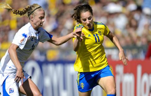 Lotta Schelin kom in i halvtid och det satte fart på det svenska anfallsspelet. Sverige skapade chanser men målvakt Gudbjörg Gunnarsdottir stod i vägen halvleken ut. Island, och framför allt Sara Björk Gunnarsdottir, hade en bra möjlighet att göra 3-0 med kvarten kvar av matchen. Men bollen smet utanför stolpen.